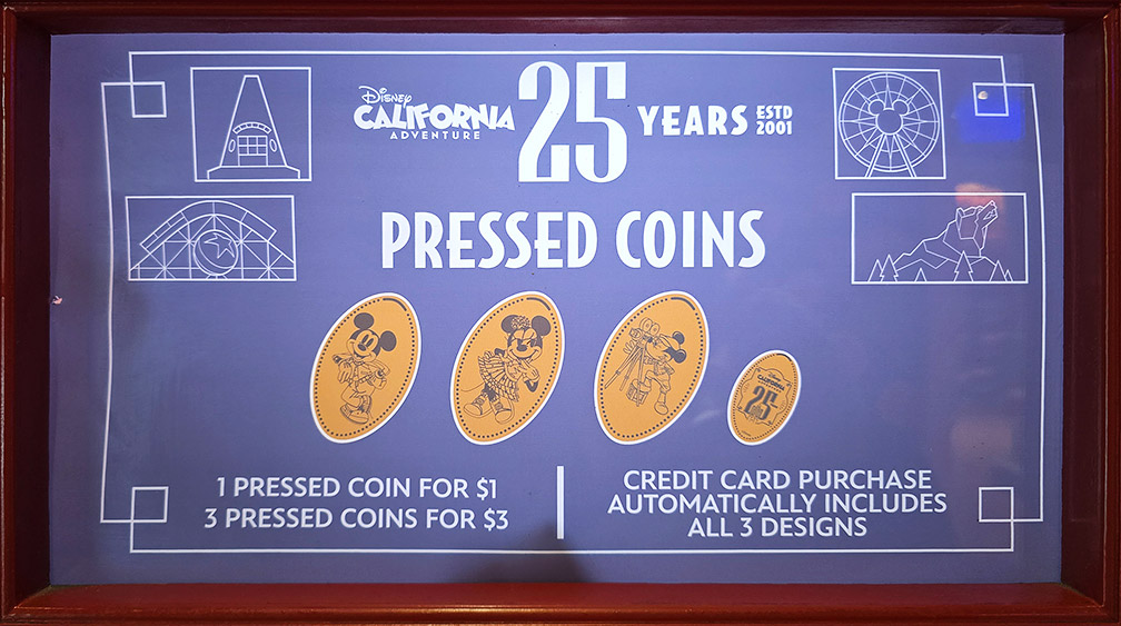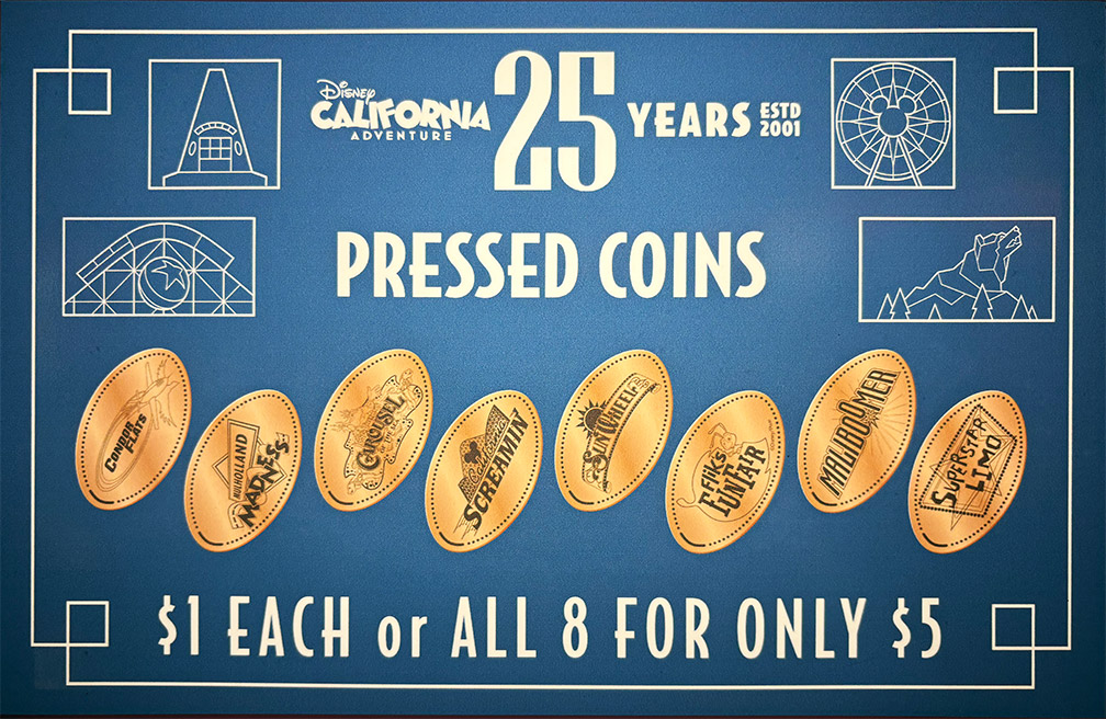 02/14/2026 Our thanks to Kerry D. for reporting a new Disney California Adventure 25 Years eight-play souvenir press at Gone Hollywood. We've already updated the Disneyland Resort Pressed Coin and Medallion Machine Locations Page. Happy collecting, Boomer.