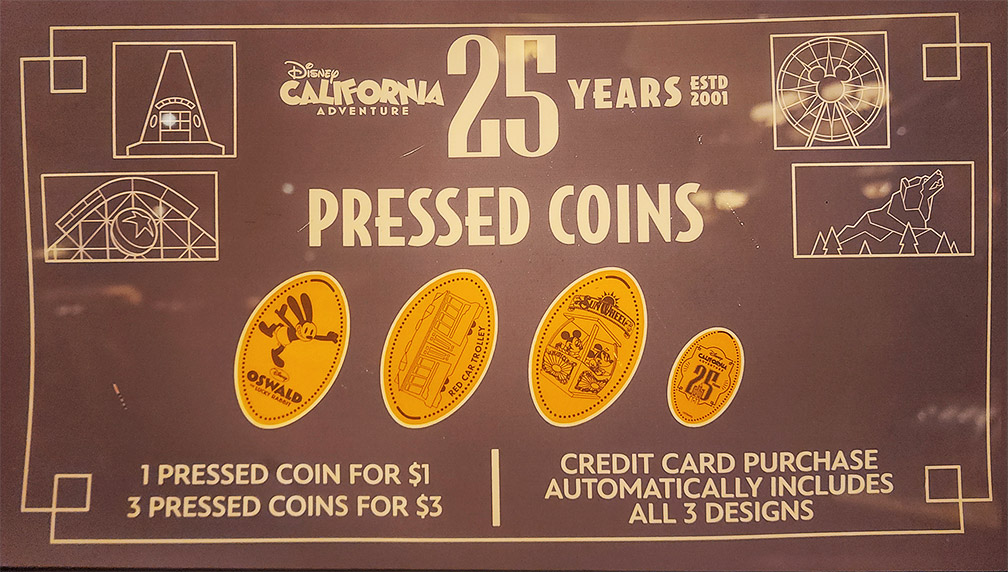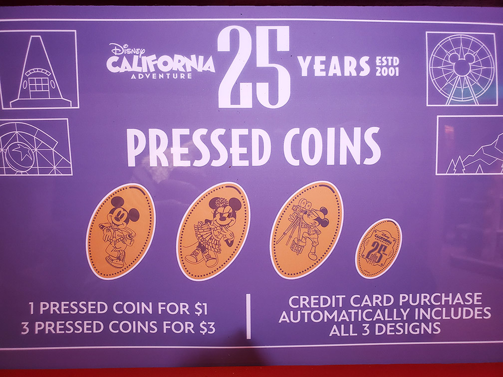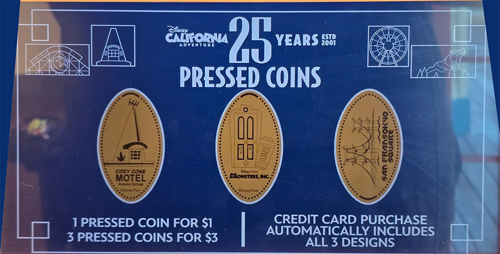 02/06/2026 Our thanks to Shay B. for reporting a new coin press at Big Top Toys in Disney California Adventure. The 25th Anniversary themed set of three pressed "coins" or planchets / blanks* is the first Disney California Adventure 25th Anniversary pressed souvenirs to be reported. A few 25th Anniversary medallions have already been placed onstage and more 25th Anniversary pressed souvenirs are rumored on the way. This appears to be the first machine placed onstage at the Disneyland Resort vending pressed planchets from the start. So much has changed in the hobby over the last 5 years.