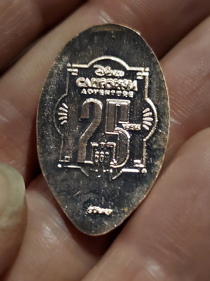 *Rumors are that Disneyland Resort "penny" presses are now all pressing or are in the process of being converted to press blank slugs or planchets. (I'm told they already do in Walt Disney World.) Fellow numismatists will correctly state these are not coins. They are planchets or slugs. But, Boomer will try to use the Disneyspeak term, "coins". This is a close-up view of the new 25th Anniversary pressed "coin" backstamp courtesy of Shay B.) We've already updated the Disneyland Resort Pressed Coin and Medallion Machine Locations Page. Happy collecting, Boomer.