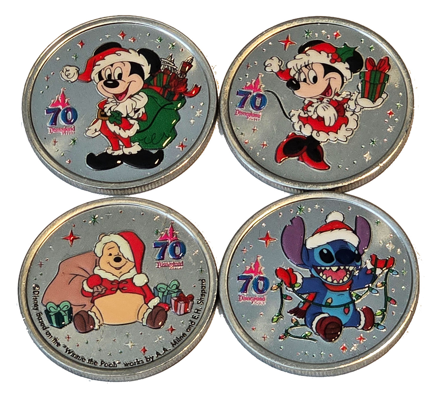 11/05-6/2025 Our thanks to Kelly B. who hosts the Pressed Penny Exchange FaceBook Group, and long-time contributor Jeremy H. for reporting and sharing images of this new set of 70th Anniversary medallions! The #247-250 set of 70th Anniversary medallions is colorized and Holiday themed, featuring Mickey, Minnie, Pooh and Stitch. The machine is located at the Penny Arcade / Candy Palace on Main Street USA, Disneyland. Cost is $8.00 each or four for $30.00. (These medallions replace the 70th medallions: #198-201 Mickey, Minnie, Pluto, Goofy which have been moved to the machine at Bing Bong's Sweet Stuff in Disney California Adventure.) We've updated the Disneyland Resort Pressed Coin and Medallion Machine Locations Page. The guide will be updated soon. Happy collecting, Boomer
