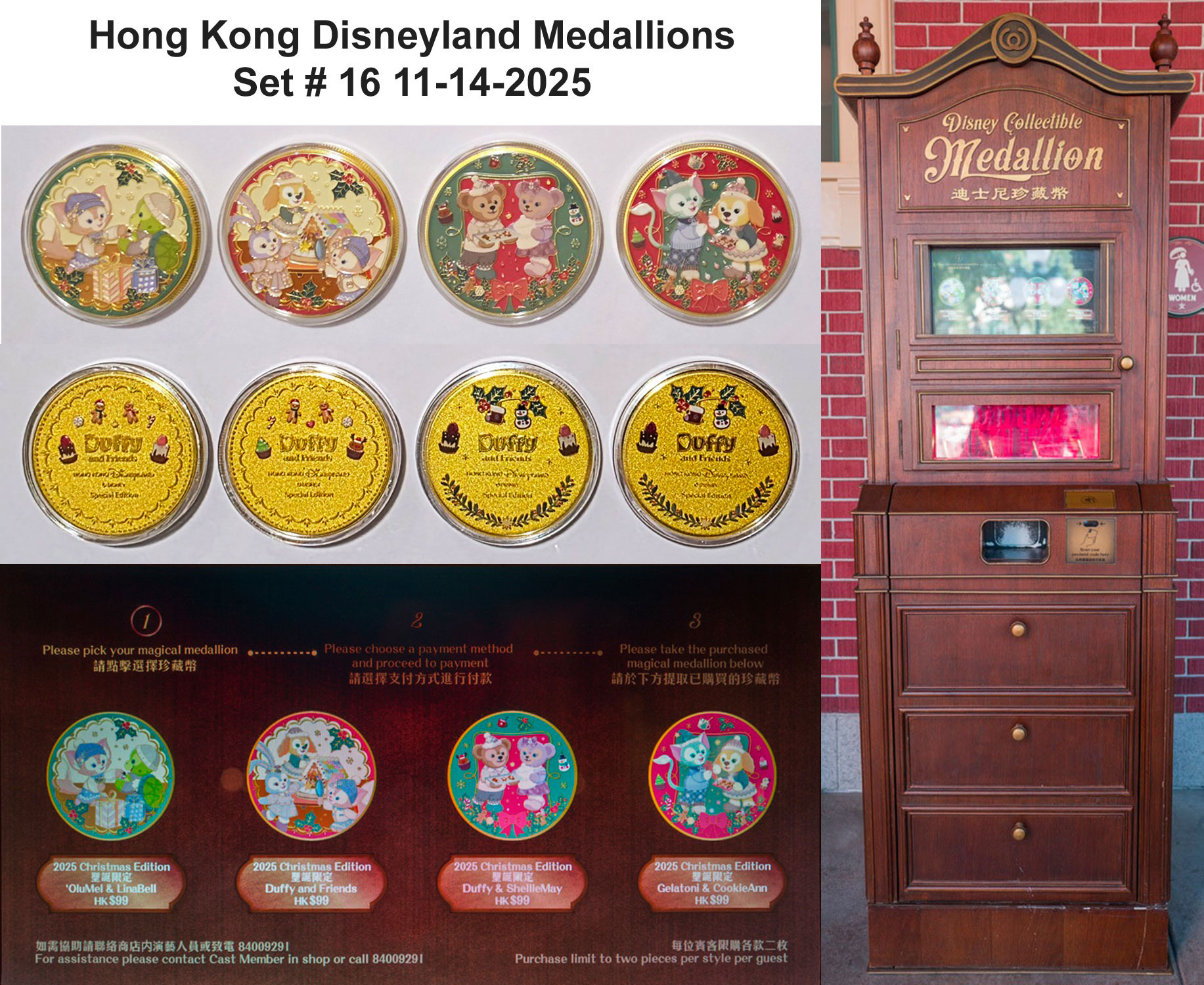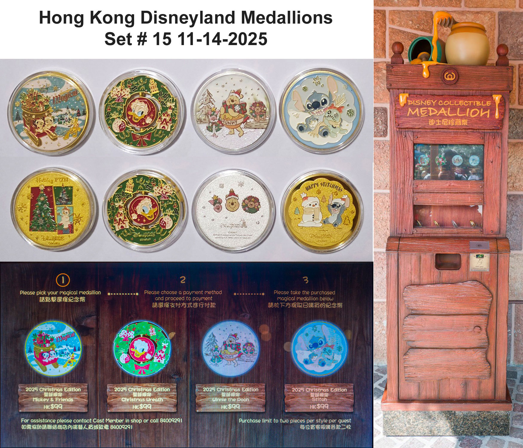 11/14/2025 Our thanks again to Alex L. in Hong Kong for sharing news and pictures of two new Hong Kong Disneyland medallion sets! Alex reports that HKDL just put on-stage two sets of Christmas themed medallions. Set #15 is placed next to the Winnie the Pooh ride in this machine, and has replaced Set #7. Set #16 is placed next to the City Hall in this machine, and has replaced Set #13. Images will be uploaded soon. Display News and images of this new medallion are posted here as well as the dedicated Hong Kong Disneyland News Page. Happy collecting, Boomer.