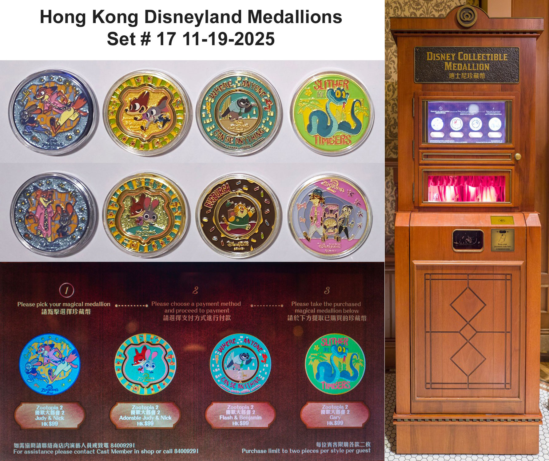 11/19/2025 Our thanks again to Alex L. in Hong Kong for sharing news and pictures of yet another set of Hong Kong Disneyland medallions! Alex reports that HKDL just put on-stage one more set of Zootopia themed medallions. The #17 machine was placed inside Emporium and replaces Set #14. Hong Kong Disneyland's promotional material indicated that there will be another set on-stage during the holiday season. Ol' Boomer is working on the excellent images shared by Alex and hopes to have them on the website soon. Display News and images of this new medallion are posted here as well as the dedicated Hong Kong Disneyland News Page. Happy collecting, Boomer.