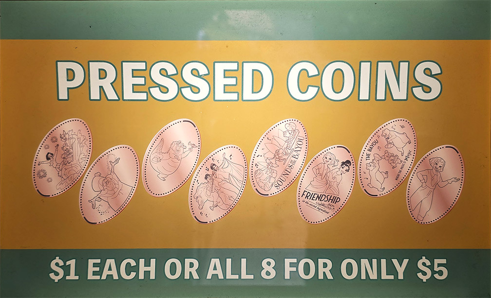 elongated coin die in its original "0" state / variation, paired with this coin's "1" or first reverse coin die, Tiana's Bayou Adventure ©Disney".) Located originally in a "Pop-Up" gift shop in the old location of the Starcade TomorrowLand, then