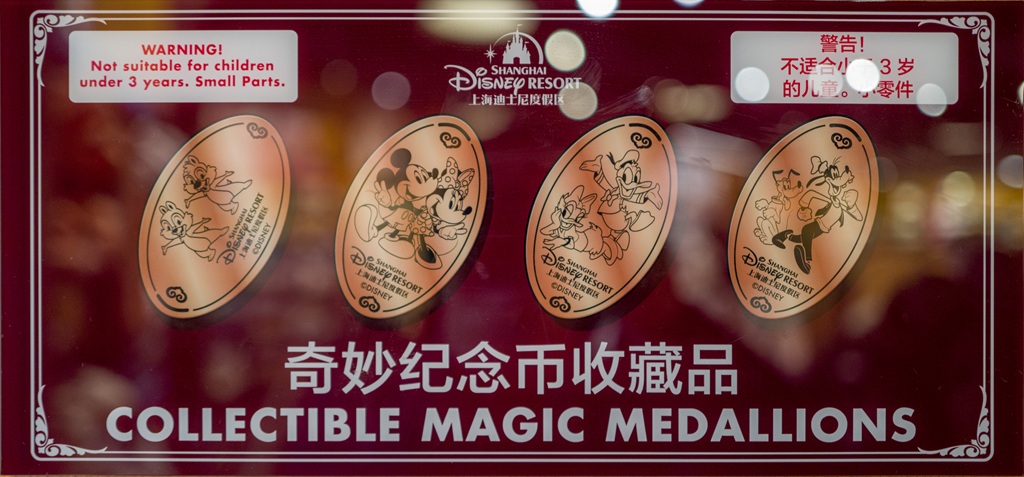 On opening day, twelve Magic Medallion pressed coin machines, placed throughout the Shanghai Disney Resort, SDR, greeted guests. These very popular souvenir presses were very diverse in both their coin image selections and machine designs. The opening Shanghai assortment of souvenir smashers included six traditional four-design hand-crank machines, five newer electric type machines offering eight different designs each, plus one electric machine offering twelve unique Zodiac designs for a total of 76 different souvenirs. Cost: 10.00 Chinese Yuan each or about $1.50 USD each. Placements were in hotels, stores, and the Disneyland theme park. Like the Tokyo Disneyland Resort and Hong Kong Disneyland Resort, Shanghai Disney Resort souvenir pressers use hopper-fed penny-sized copper planchets, much in the way similar machines press pennies in the United States. However, the vended souvenirs at SDR appear to be of more even lengths and are solid copper like pre-1982 copper cents!
