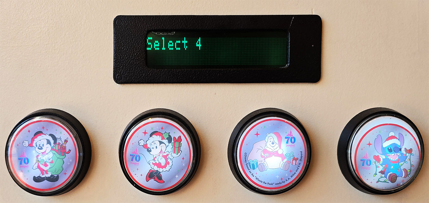 This Disneyland Resort Medallion Machine located inside the Gone Hollywood Gifts - Hollywood Boulevard, Disney California Adventure, offered the #229-232 Colorized 70th Anniversary medallions. The first 30 Disneyland 70th Anniversary medallions were issued by May 15, 2025, with some a day or so earlier. This second group, sometimes referred to by Disney as "Phase 2", were placed onstage staring on July 17, 2025. All medallions in this were bright silver in color with raised