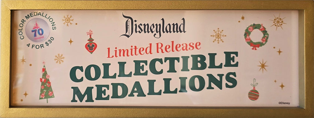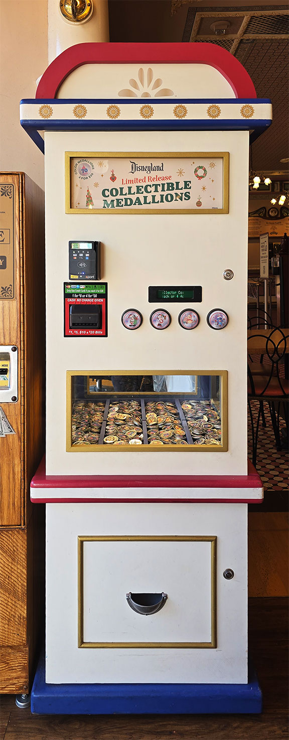 This Disneyland Resort Medallion Machine located inside the World of Disney Gifts, Downtown Disney, Disneyland Resort, offered the #233-236 Colorized 70th Anniversary medallions. The first 30 Disneyland 70th Anniversary medallions were issued by May 15, 2025, with some a day or so earlier. This second group, sometimes referred to by Disney as "Phase 2", were placed onstage staring on July 17, 2025. All medallions in this were bright silver in color with raised