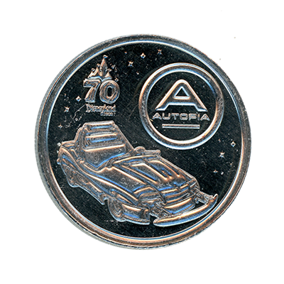 DRM0256 Autopia Car and Logo, Disneyland Resort 70th Anniversary medallion. This bright silver colored Disneyland Resort 70th Anniversary medallion features a 70th Anniversary logo above "Disneyland Resort" with an Autopia car at center and an Autopia logo above. Stars accent the background in the sky above. This medallion also featured a