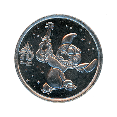 DRM0258 Stitch Playing his Ukulele, Disneyland Resort 70th Anniversary medallion. This bright silver colored Disneyland Resort 70th Anniversary medallion features a 70th Anniversary logo above "Disneyland Resort" with Stitch playing an Ukulele ("oo-koo-lay-lee") and stars in the sky above. This medallion also featured a