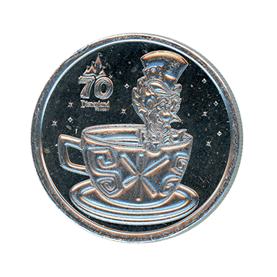 DRM0259 Mad Hatter Riding in a Tea Cup, Disneyland Resort 70th Anniversary medallion. This bright silver colored Disneyland Resort 70th Anniversary medallion features a 70th Anniversary logo above "Disneyland Resort" with The Mad Hatter enjoying a ride in a tea cup, with stars in the sky above. This medallion also featured a