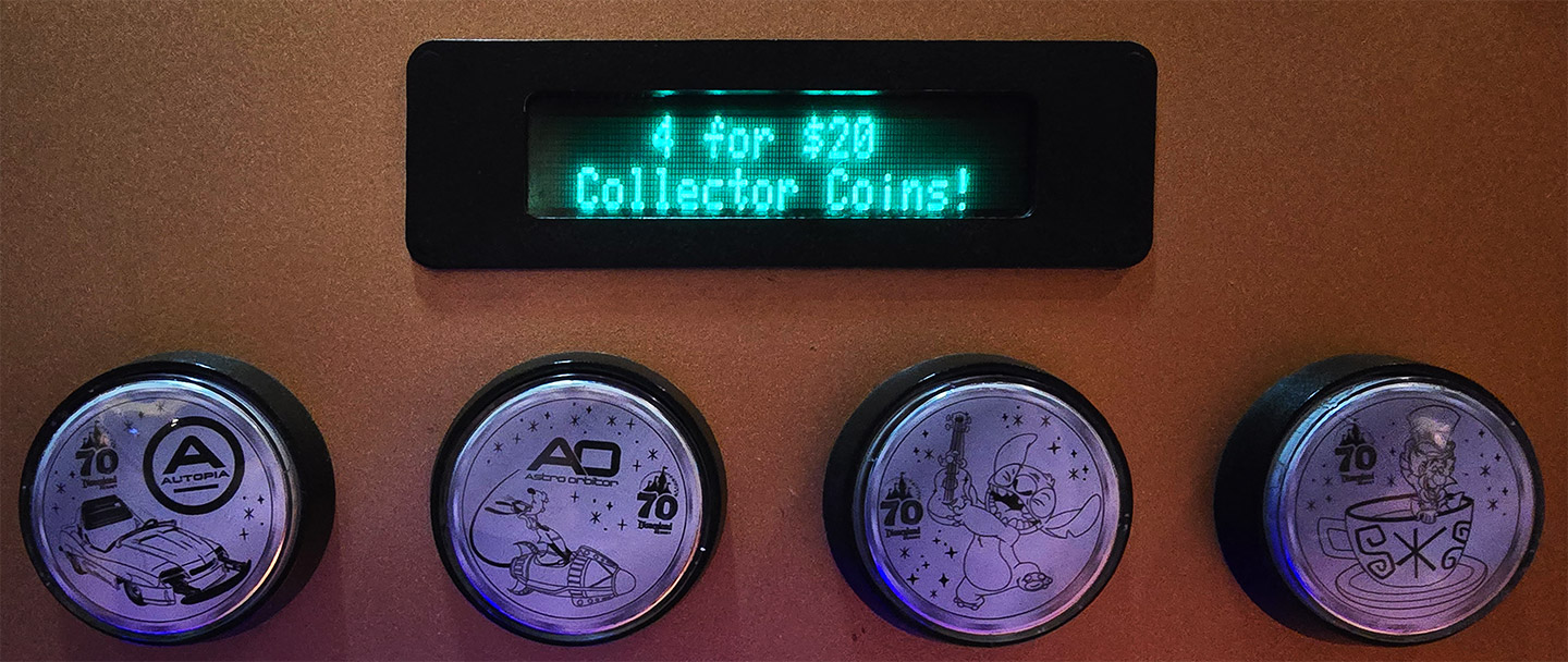 The medallions offered by this machine on December 25, 2025, were Button 1: #256 70th Logo Autopia Car and Autopia Logo, Button 2: #257 70th Logo Astro Orbiter and Astro Orbiter Logo, Button 3: #258 70th Logo Stitch with Ukulele, Button 4: #259 70th Logo Mad Hatter in Tea Cup. The machine was located in Tomorrowland, near Star Trader in the exit lane from Space Mountain. These 70th Anniversary medallions replaced the #214, 215, 216, and 217 medallions which were previously held by this machine at this location.