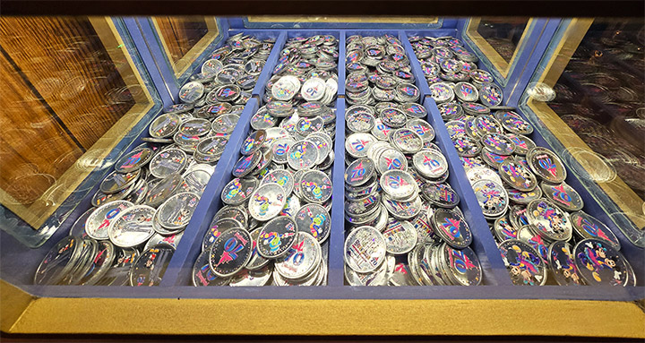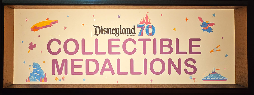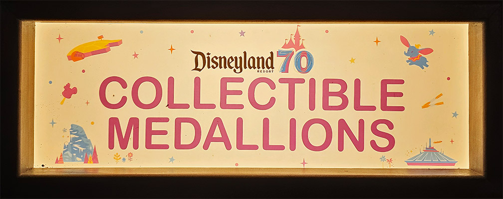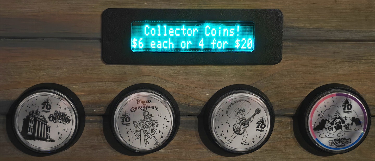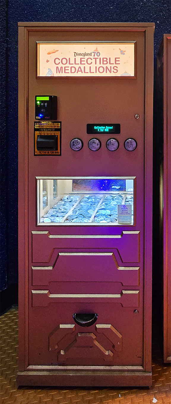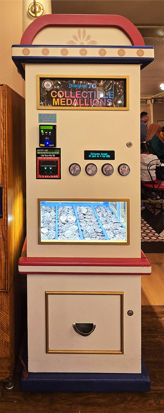 This Disneyland Resort Medallion Machine located inside the Candy Palace / Penny Arcade, Main Street USA, offered the #256-259 70th Anniversary medallions. The first 30 Disneyland 70th Anniversary medallions were issued by May 15, 2025, with some a day or so earlier. The second group, were colorized over the silver base and first placed onstage staring on July 17, 2025. All 70th Anniversary medallions were a bright silver in color with raised