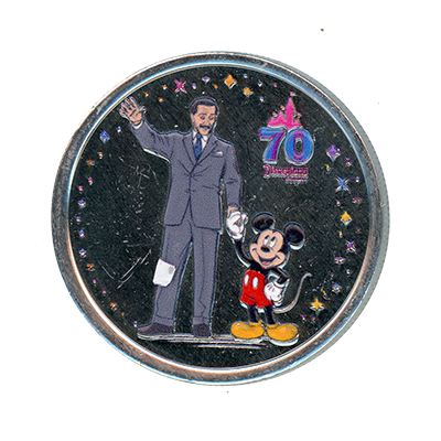DRM0252 Walt Disney and Mickey Mouse, Partners Colorized 70th Anniversary medallion. This colorized silver Disneyland Resort 70th Anniversary medallion features a 70th Anniversary logo above "Disneyland Resort". Walt Disney and Mickey Mouse are in their "Partners" pose surrounded by stars. This medallion has no copyright notice on the obverse other than the Disneyland Resort trademark and features a