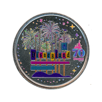 Disneyland Resort 70th Anniversary Colorized REVERSE: Colorized "70th, Disneyland Resort, ©DISNEY" This silver colored medallion reverse is colorized and features a large number "70" under a stylized castle at center over "Disneyland, RESORT". A border of stars is broken at the bottom center by "©Disney", stars make a border around the edge of the medallion. This colorized variation of the Disneyland Resort 70th Anniversary medallion reverse was first placed onstage July 17, 2025 in the Gone Hollywood Gift Shop in Disney California Adventure and in the World of Disney Gift Shop in Downtown Disney. This reverse design is common to all colorized 70th Anniversary medallions, although slight variations may exist.