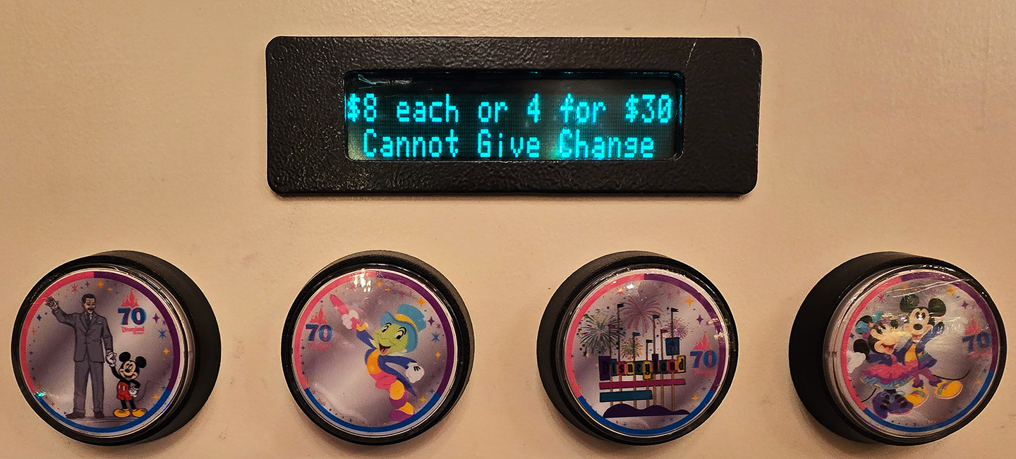 This Disneyland Resort Medallion Machine located inside the Candy Palace / Penny Arcade, Main Street USA, offered the #252-255 Colorized 70th Anniversary medallions. The first 30 Disneyland 70th Anniversary medallions were issued by May 15, 2025, with some a day or so earlier. This second colorized group, were first placed onstage staring on July 17, 2025. All 70th Anniversary medallions were bright silver in color with raised