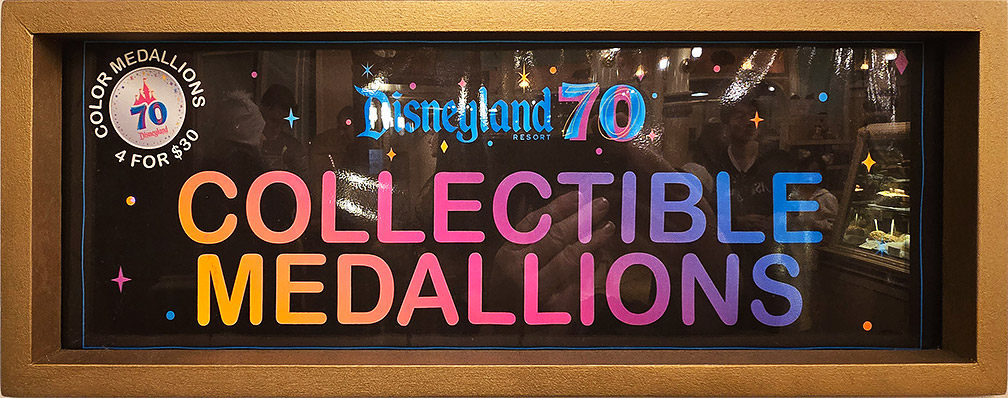 All Disneyland Resort 70th Anniversary medallions were initially priced at $6.00 each or $20.00 when purchased in multiples of four setting a new price for all onstage medallions. (This is an increase from the original Disneyland Resort non-70th Anniversary vended medallion price of $5.00 each or $15.00 when purchased in multiples of four.) Colorized 70th Anniversary medallions, first introduced on July 17, 2025, were initially priced at $8.00 each or $30.00, if purchased in multiples of four bringing the price for a set of four from $15.00 to $30.00.