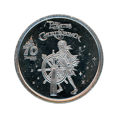 DRM0261 Pirates of the Caribbean Disneyland Resort 70th Anniversary medallion. This bright silver colored Disneyland Resort 70th Anniversary medallion features a 70th Anniversary logo above "Disneyland Resort" with an image of The Pirates of the Caribbean Skeleton a the helm of his sailing ship, banner reads "Pirates of the Caribbean" above, with stars in the background. The medallion has no copyright notice on the obverse and features a