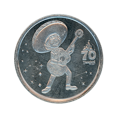DRM0262 Miguel of Coco Disneyland Resort 70th Anniversary medallion. This bright silver colored Disneyland Resort 70th Anniversary medallion features a 70th Anniversary logo above "Disneyland Resort" with an image of Miguel of Coco playing his guitar with stars in the background. The medallion has no copyright notice on the obverse and features a