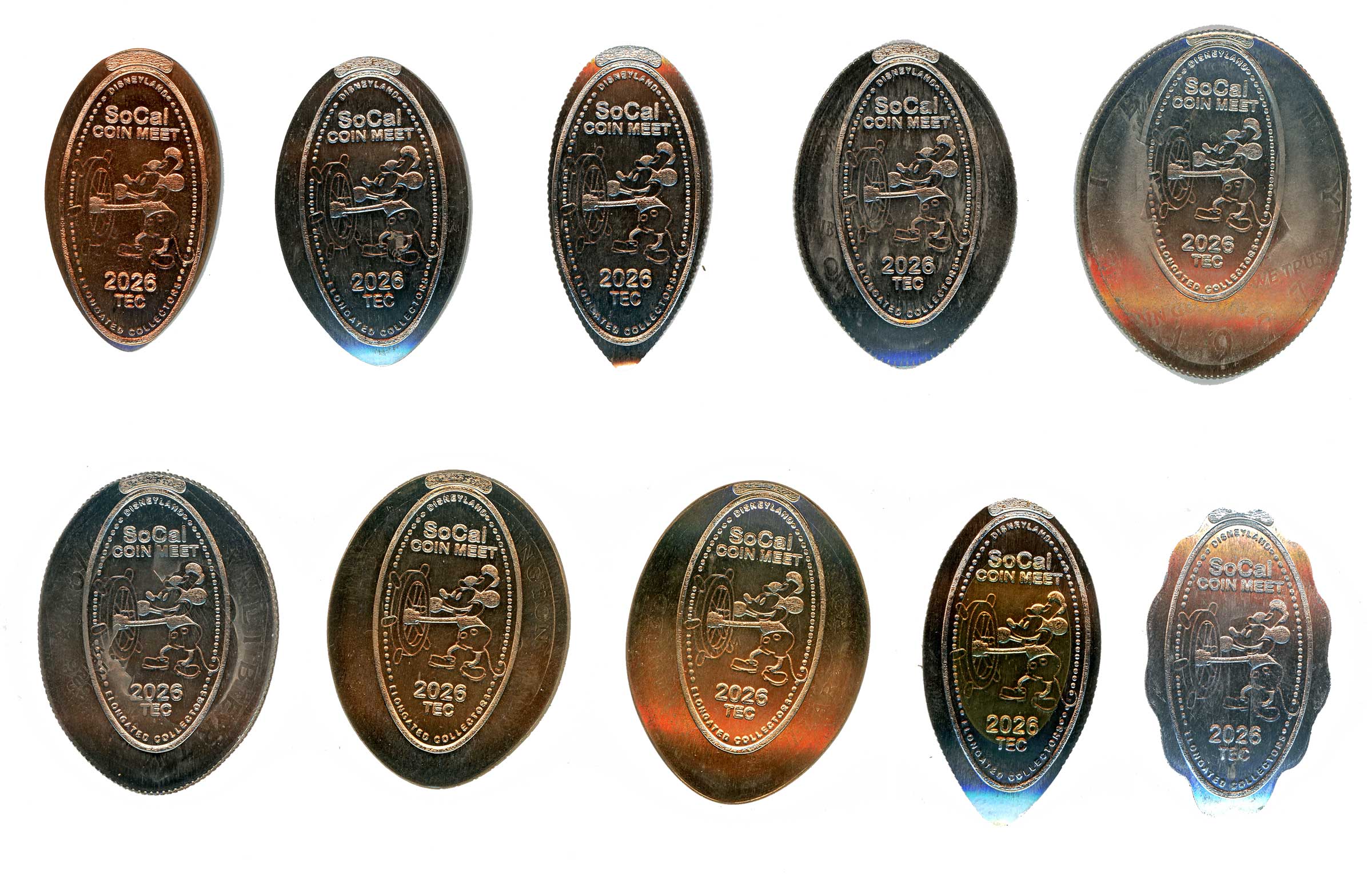DT0037 vertical elongated coin image, "SoCal COIN MEET 2025, TEC, DISNEYLAND ELONGATED COLLECTORS". This detailed design includes "SoCal COIN MEET 2025", image of the State of California with a Mickey head silhouette marking the location of the coin meet, "TEC, DISNEYLAND ELONGATED COLLECTORS", with the designer / roller's initials "DC" for Don Cade inside the dot border at the top center of the design. This coin is very much like the DT0032 SoCal Coin Meet 2023 coin, with the exception of the Mickey Silhouette vs. a star to mark the location of the meet within the California State outline. As were other coins in this guide to Don's Tributes, the DT0037 was designed, commissioned and made by the well-known elongated coin collector and roller, Donald Cade. The coin was first shown publicly at the March 15, 2025 TEC Meet held at Yorba Regional Park, Anaheim California. The host of the event, Michael Haley, gave all attendees of this meet a sample pressed penny and quarter of this very limited elongated coin. The very limited numbers of DT0037 coins pressed were 28 Canadian pennies, 28 Yosemite quarters, some of which were distributed at the coin meet, plus 15 sets of penny, nickel, dime, quarter and Presidential dollar. Because these coins were exclusively pressed for the host of the event, they were never offered via a public coin press machine. (This Disneyland pressed coin number made with the possibly now canceled#DCT0034.0.0 obverse elongated coin die in its original "0" state / variation, paired with a blank "0" reverse coin die.) Large image of this DT0037 "SoCal COIN MEET 2025, TEC, DISNEYLAND ELONGATED COLLECTORS" coin. View the entire set of these DT0037 elongated coins here: "SoCal COIN MEET 2025, TEC, DISNEYLAND ELONGATED COLLECTORS" elongated coin set. Larger elongated cent image in